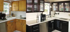 One option is to use a full overlay, which consists of sanding down the surface, applying a clear veneer to cover the existing door surfaces, and putting on a fresh top coat. This allows you to create a brand new look without having to completely replace the doors, and the drawers. Another option is to use a “drawer refacing” service. This option means putting on a new finish and then sanding everything down to remove scratches. Then, you simply apply a thin coat of polyurethane over the newly sanded surfaces to protect them, and your cabinet refinishing is complete.